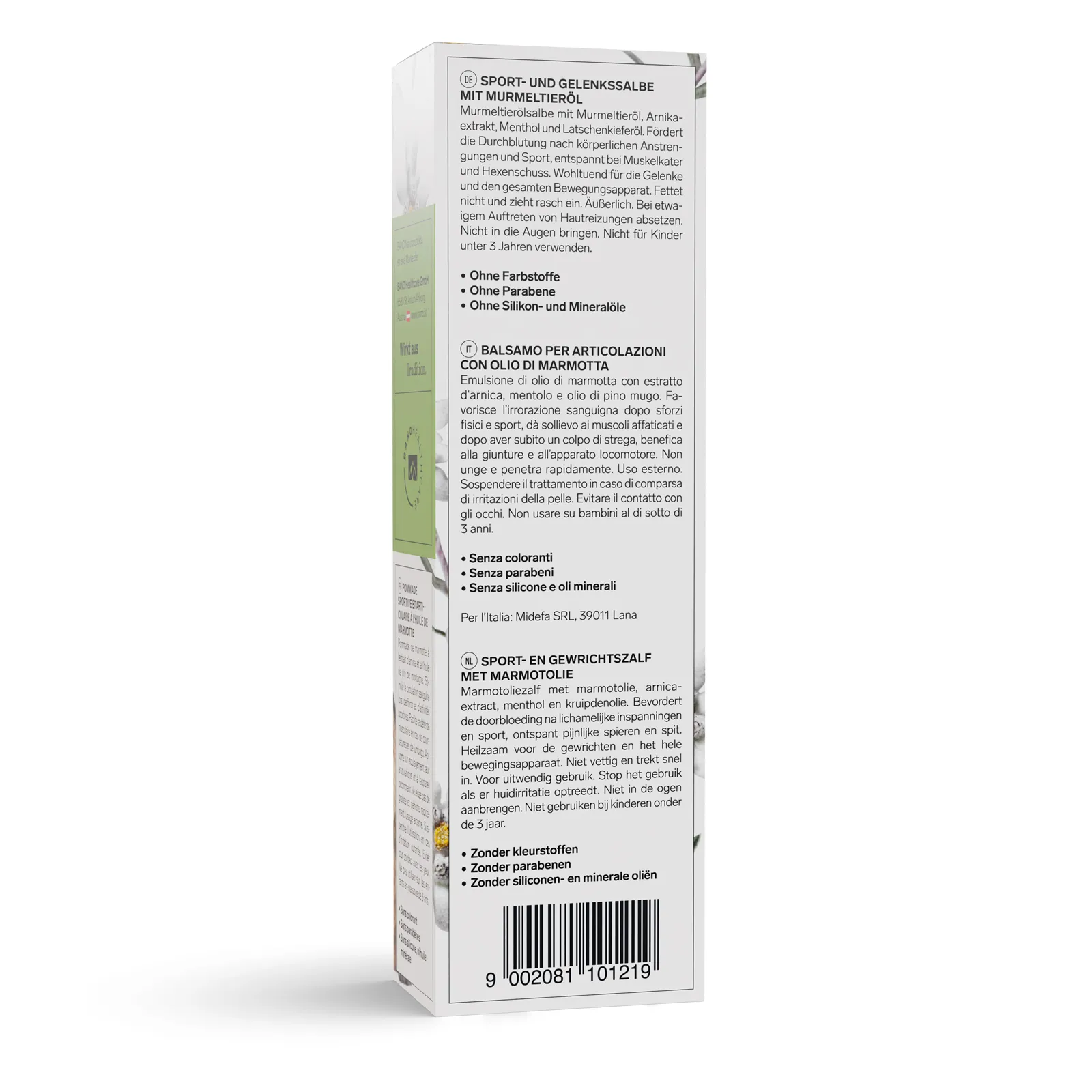 Die Inhaltsstoffe wie das wertvolle Murmeltieröl, echtes Arnikaextrakt, kühlendes Menthol sowie das herrlich riechende Latschenkiefernöl machen diese Sport- und Gelenksalbe zu einer natürlichen Lösung bei muskulären Verspannungen und wirken wohltuend auf den gesamten Bewegungsapparat.