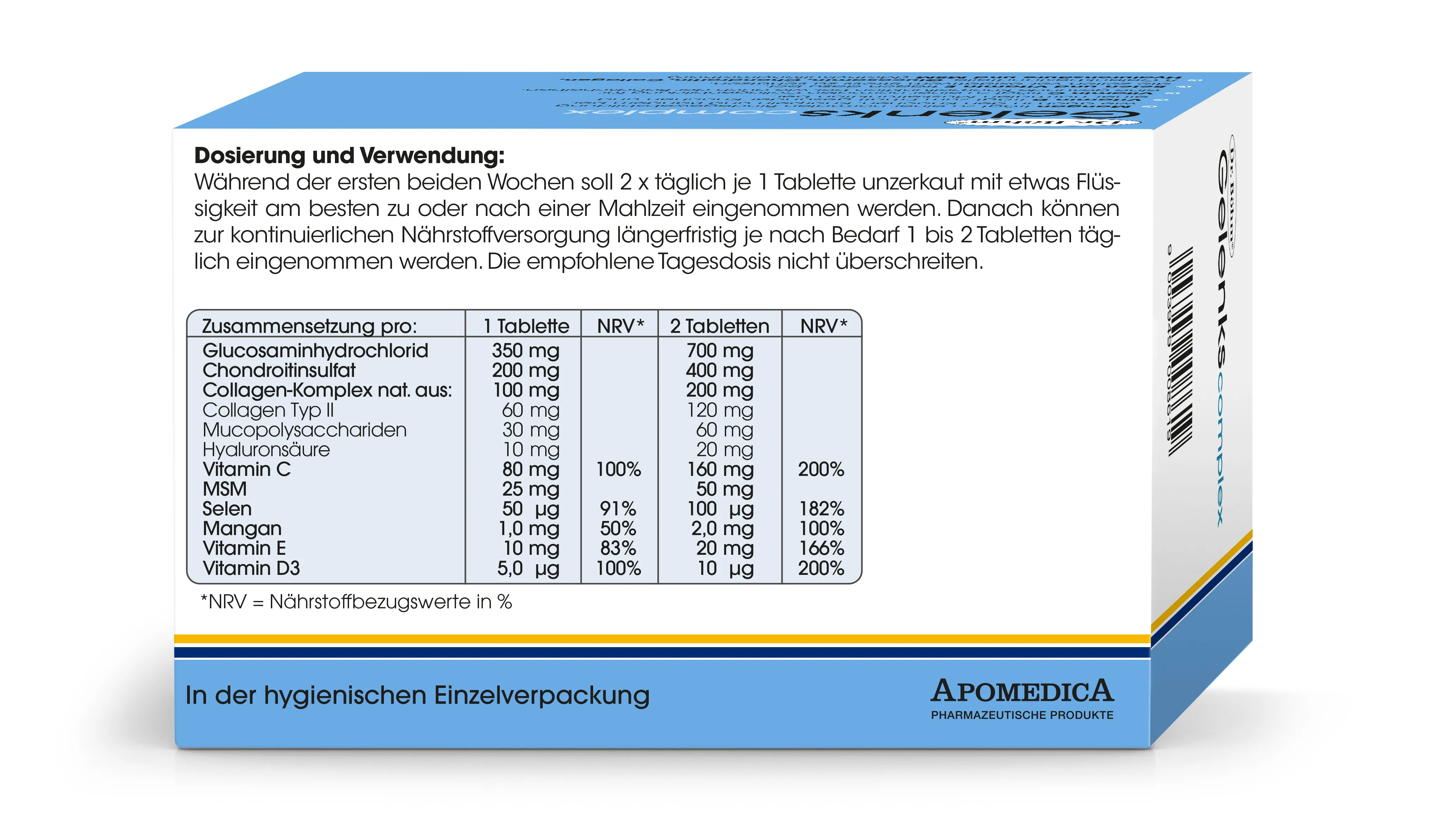 Eine innovative Kombination aus Vitaminen und Mikronährstoffen, zusätzlich mit den fünf wichtigsten Gelenk- und Knorpelbestandteilen als Gelenknahrung.