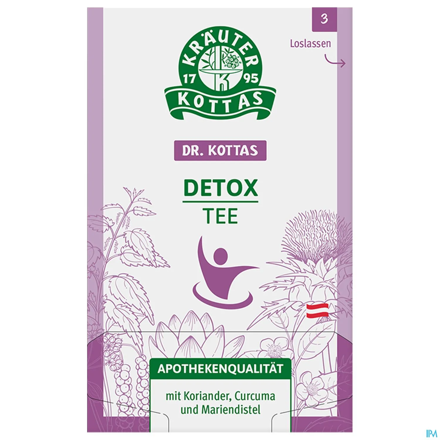 Der ideale Zeitpunkt für Ihre Detox-Kur.R. KOTTAS Detox-Tee für die sanfte Reinigung von innen mit: Brennesselblätter* helfen bei der Durchspülung der Nieren. Curcumawurzel*, Mariendistelfrüchte*, Löwenzahnwurzel* tragen zu einer normalen Leberfunktion bei und aktivieren durch ihre Bitterstoffe den Gallenfluss. Die Curcumawurzel ist außerdem zusammen mit schwarzem Pfeffer* beliebt in vielen Detox-Rezepturen. Korianderfrüchte* bringen mit ihren entblähenden Eigenschaften die Verdauung in Schwung. Grüntee* ist anregend und aktiviert Körper und Geist. Lemongras* und Apfelminze* geben den frischen Geschmack. *aus kontrolliert biologischer Landwirtschaft