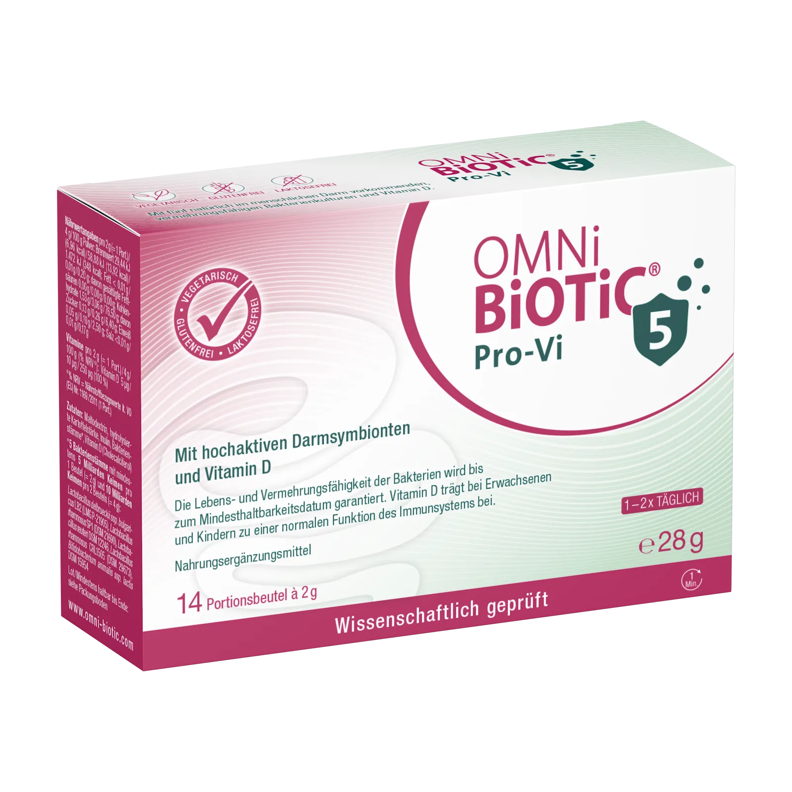 OMNi-BiOTiC® Pro-Vi 5 enthält eine innovative und weltweit einzigartige Kombination von 5 Milliarden Darmbakterien aus 5 verschiedenen Stämmen in einer Portion, die natürlich im menschlichen Darm vorkommen. Ergänzt werden die wissenschaftlich geprüften Bakterienstämme mit Vitamin D, welches zu einer normalen Funktion der Abwehrkraft beiträgt.