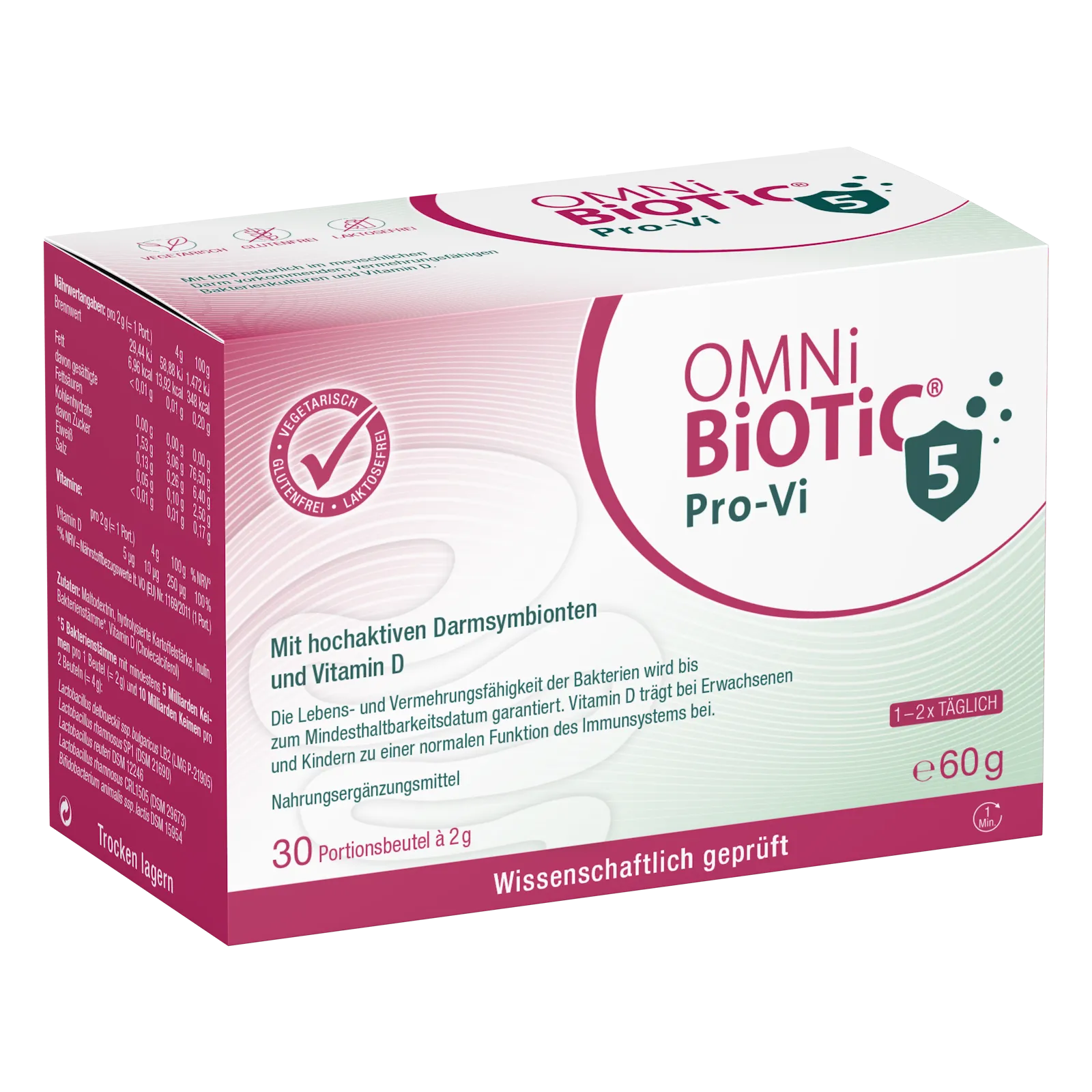 OMNi-BiOTiC® Pro-Vi 5 enthält eine innovative und weltweit einzigartige Kombination von 5 Milliarden Darmbakterien aus 5 verschiedenen Stämmen in einer Portion, die natürlich im menschlichen Darm vorkommen. Ergänzt werden die wissenschaftlich geprüften Bakterienstämme mit Vitamin D, welches zu einer normalen Funktion der Abwehrkraft beiträgt.