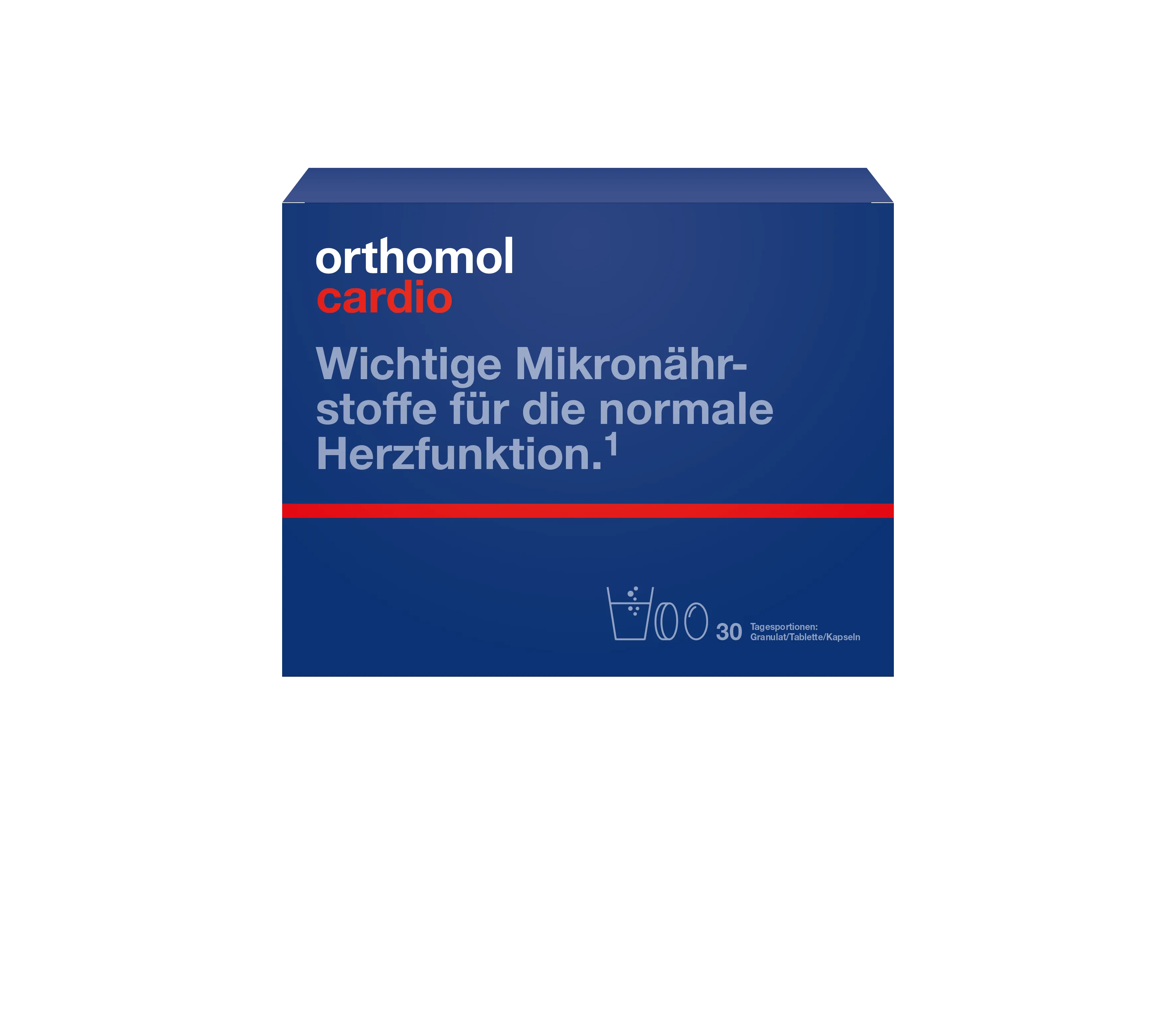 Orthomol Cardio ist ein Nahrungsergänzungsmittel. Wichtige Mikronährstoffe für die normale Herzfunktion. Mit den Omega-3-Fettsäuren EPA und DHA sowie Vitamin B1 (Thiamin) als Beitrag zu einer normalen Herzfunktion. Mit Kakaopolyphenolen.