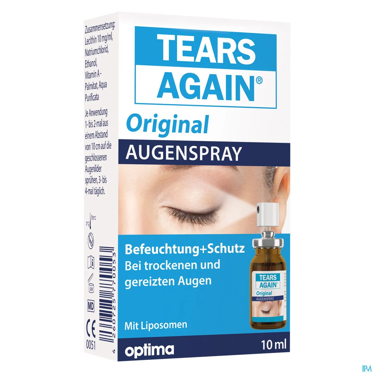 Bei Anwendung von TEARS AGAIN® liposomaler Augenspray wird die Lipidschicht der Tränenflüssigkeit stabilisiert, die Lidtemperatur sinkt und daher wird die Tränenverdunstung signifikant verringert. Es kommt zu einer raschen und anhaltenden Verbesserung der Symptome des „Trockenen Auges“. Etwaiges Kratzen oder Unwohlsein des Auges verschwindet und ein angenehmes Gefühl entsteht. TEARS AGAIN® liposomaler Augenspray bietet eine neue und innovative Applikationsform: Er wird 1 – 4 mal täglich auf das geschlossene Lid oder auf die Innenseite des Fingers gesprüht und dann sanft auf Augenlid und Lidrand einmassiert. Ein weiterer besonderer Vorteil ist, dass TEARS AGAIN® liposomaler Augenspray nicht wie übliche Augentropfen nach nur vier Wochen nach dem Anbruch zu verwerfen ist, sondern bis zum Ende des auf der Packung angegebenen Datums verwendet werden kann. Dies kann bis zu einigen Jahren sein. TEARS AGAIN® liposomaler Augenspray kann bei jeder Art von „Trockenem Auge“ angewendet werden.0 von 0 Bewertungen